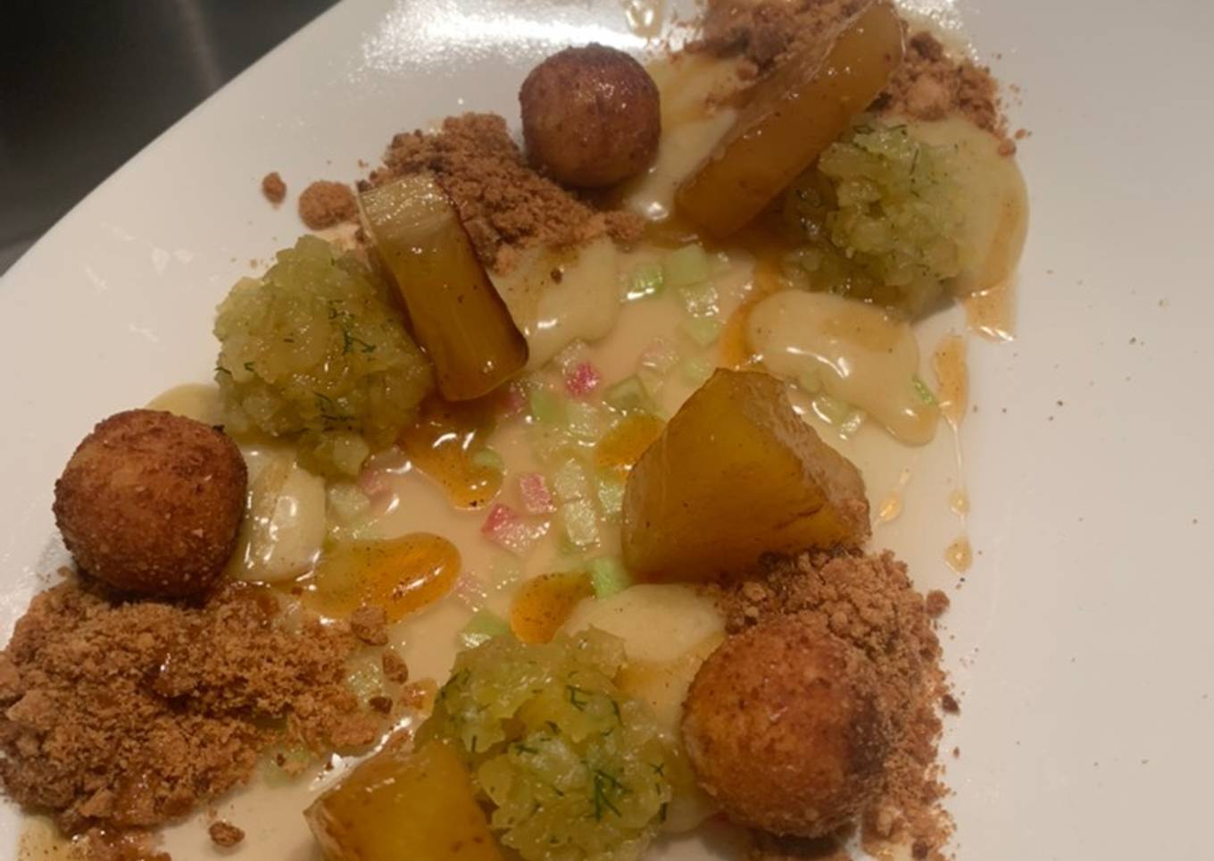 Ananas,miel,radis Green meat et cromesquis de crème fumée au foin