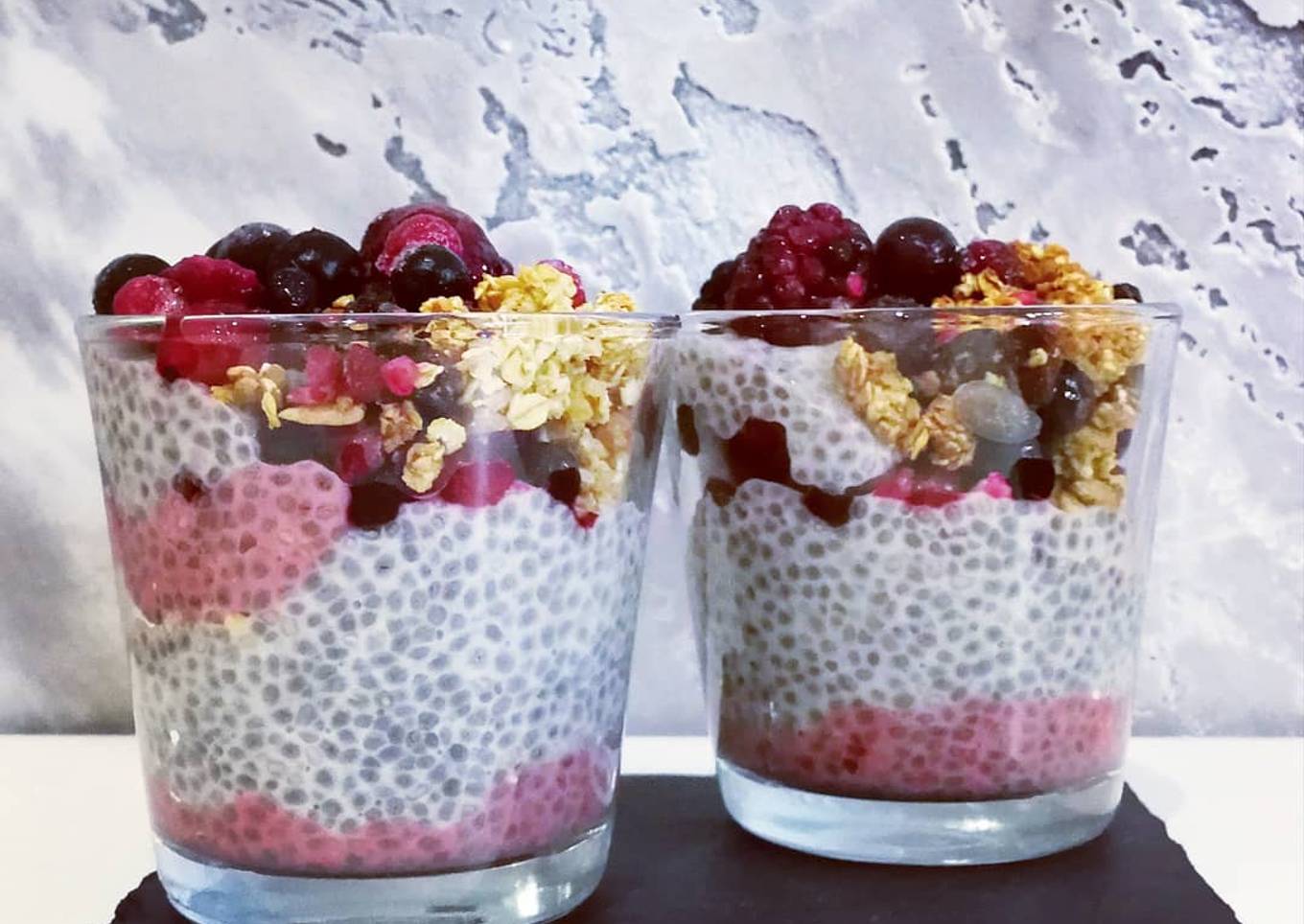 Hey hey! Oh les jolies verrines 🤩 Pudding de chia, fruits rouges et granola maison ! (il faut bien perdre les calories du tiramisu 😉)