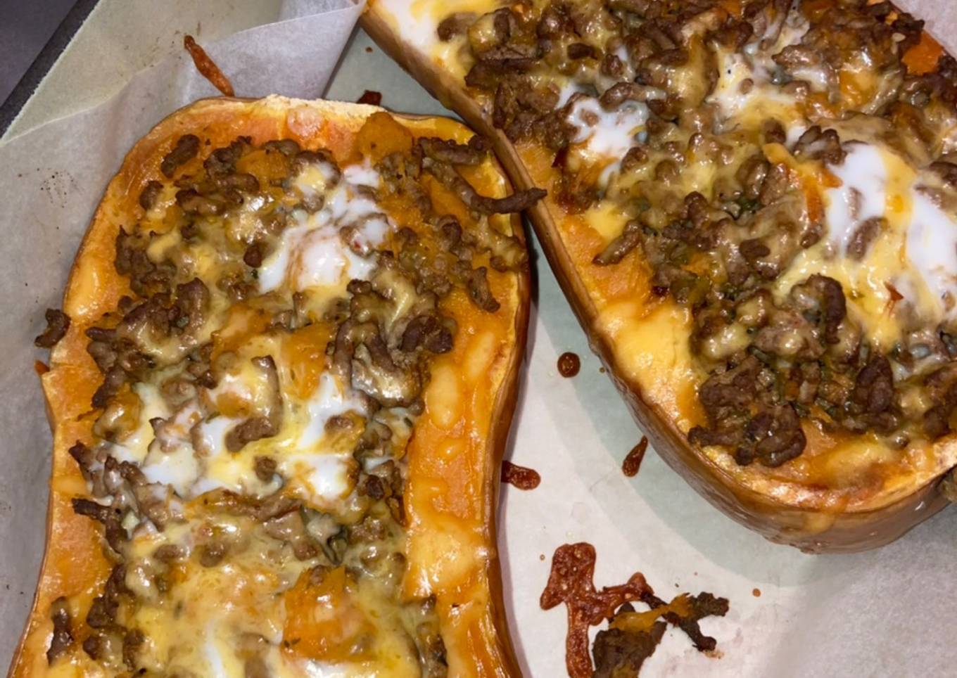 - Garnir les deux moitiés de butternut, saupoudrer avec le cheddar restant. Recouvrir de papier sulfurisé et aluminium.