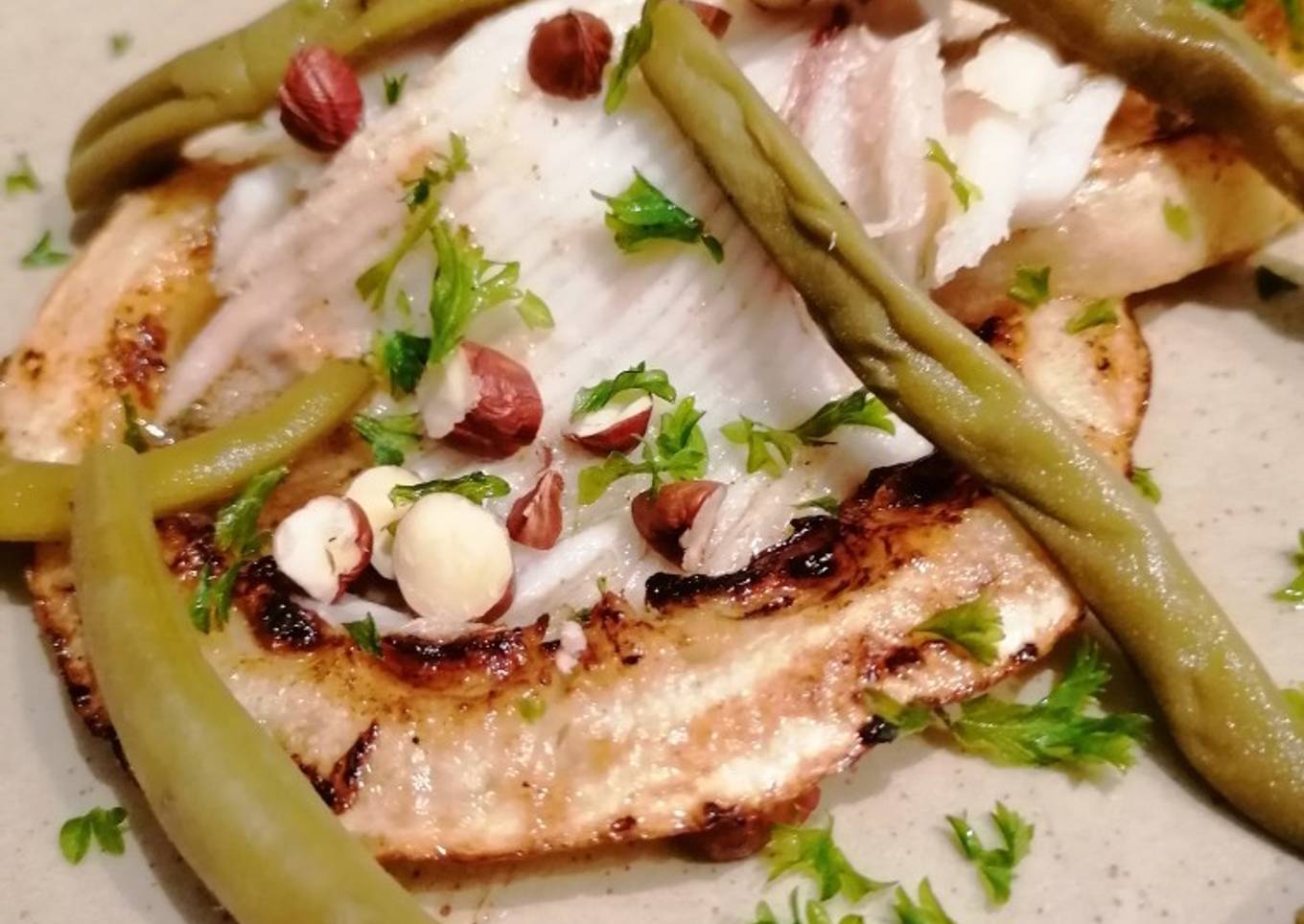- Dans une assiette mettre les tranches de patisson au centre puis les effilochés de raie recouvrer de beurre noisette de persil haché et d'un concassé de noisettes