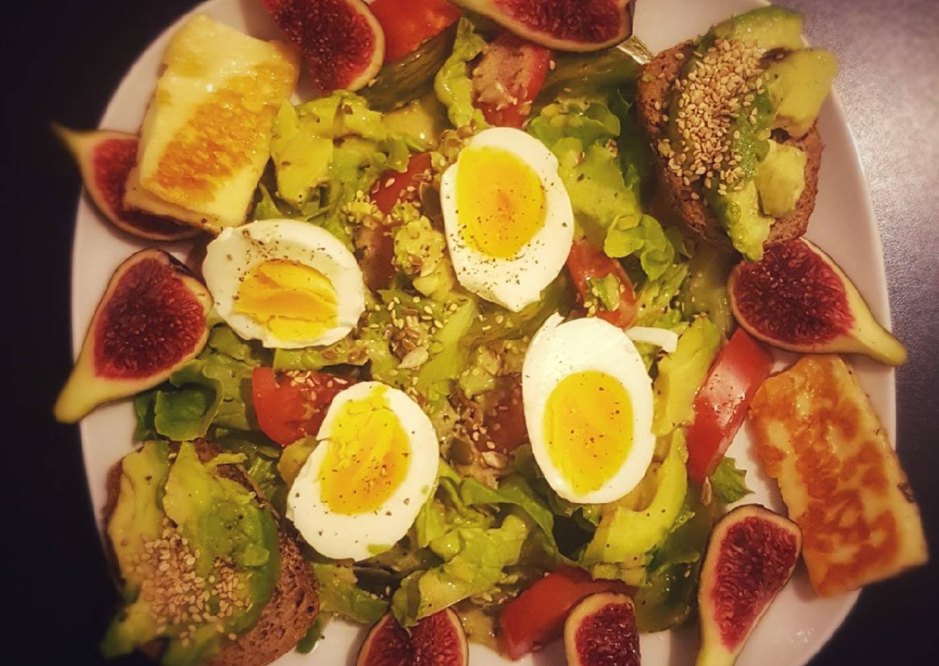- Faites cuire vos oeufs durs et faites revenir 2 tranches d'haloumi à la poêle.