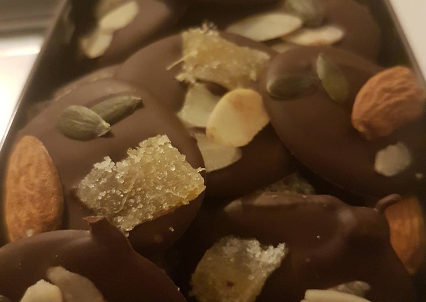 - Formez vos disques de chocolat avec une cuillère à café sur une feuille de papier sulfurisé. Disposez votre garniture selon vos goûts. Laissez le chocolat figer.