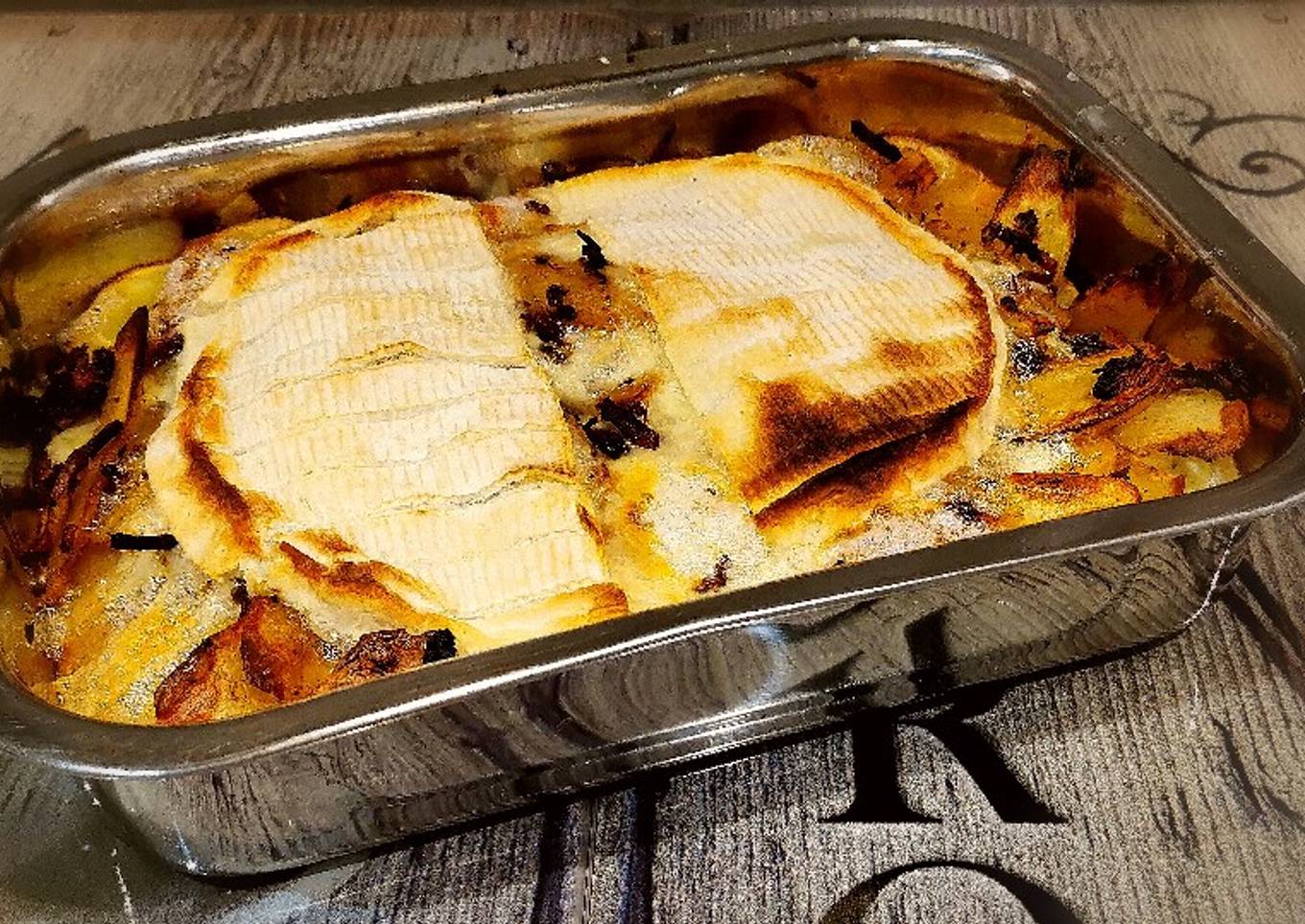 🇬🇧 Cover with leftover of potatoes/bacon and apply 2 half circles of Reblochon cheese