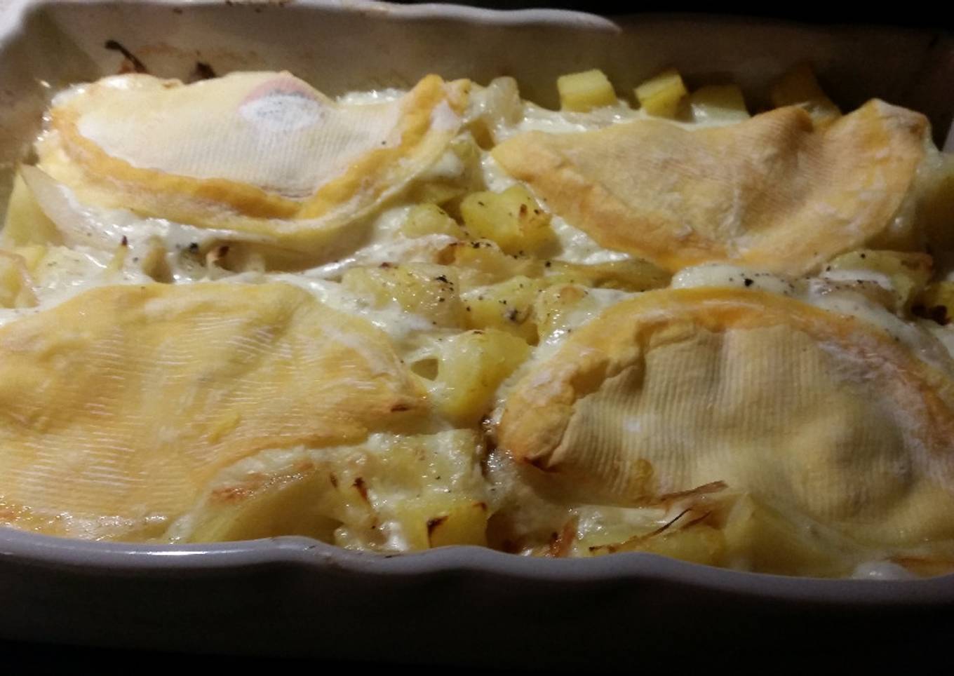 - Verser la moitié des pommes de terre dans un plat à cuisson. Ajouter le mélange oignons/lardons. Recouvrir avec le reste de pommes de terre.
